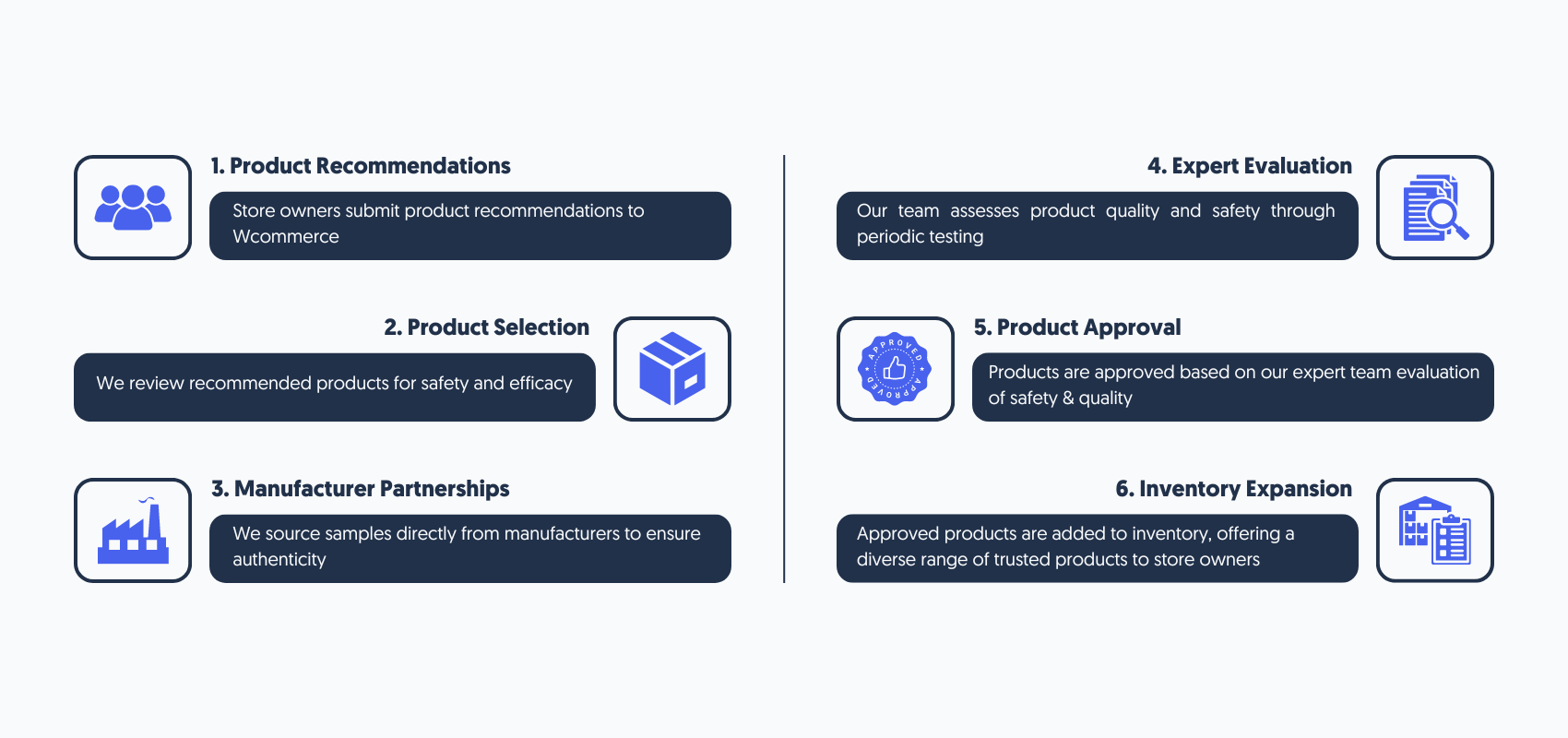 Wcommerce में, हम सहयोग में विश्वास करते हैं। हम अपने प्लेटफ़ॉर्म के लिए उत्पादों की सिफारिश करने के लिए स्टोर मालिकों को सक्रिय रूप से आमंत्रित करते हैं। ये अनुशंसाएं कठोर पुनरीक्षण प्रक्रिया से गुजरती हैं, जिसकी शुरुआत प्रारंभिक स्क्रीनिंग से होती है और इसका समापन पूर्ण विशेषज्ञ समीक्षा के रूप में होता है। केवल वे उत्पाद जो हमारे कड़े मानदंडों को पूरा करते हैं, हमारी इन्वेंट्री में जगह बनाते हैं।