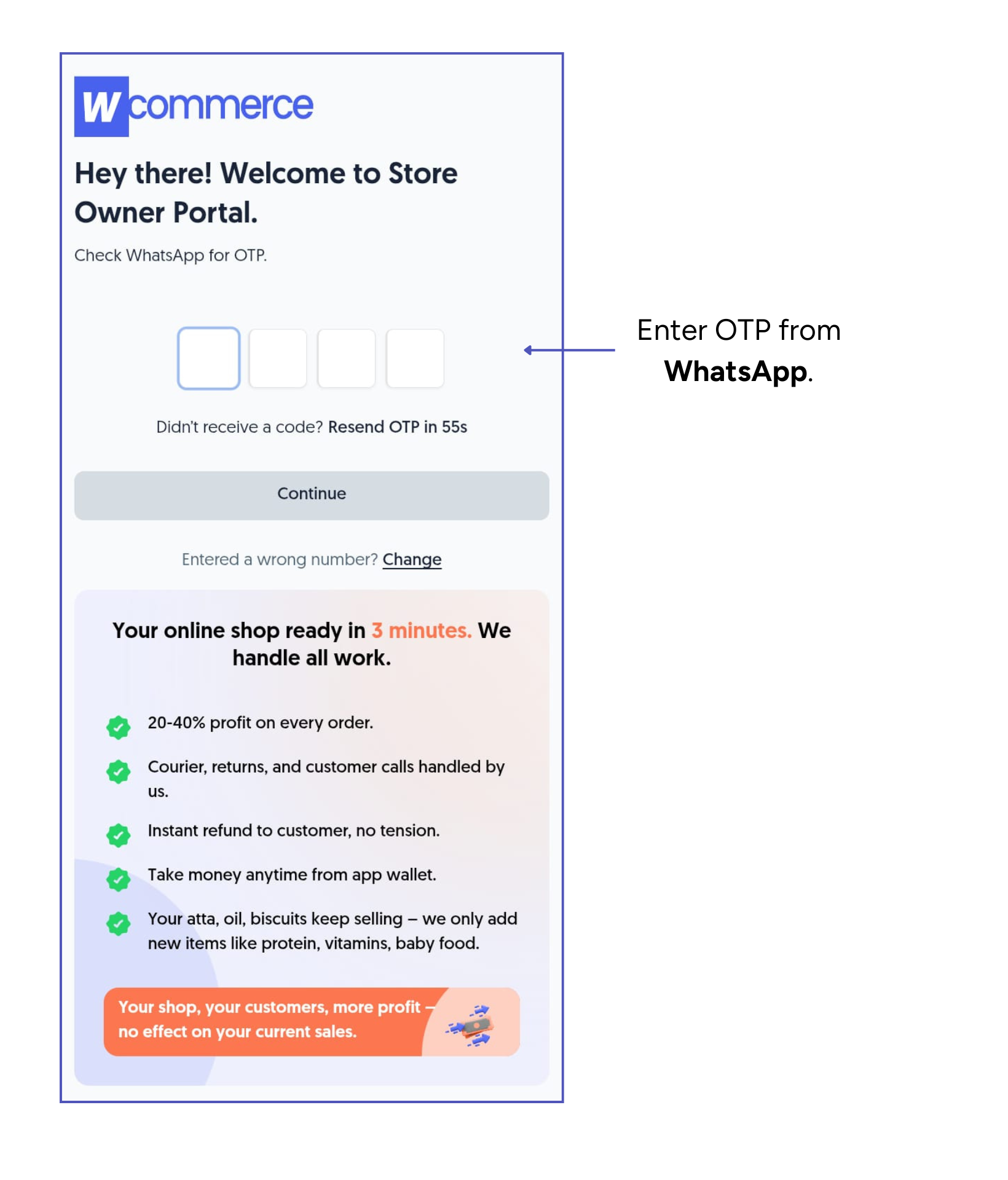 After entering your number, you’ll receive a 4-digit OTP on your WhatsApp.