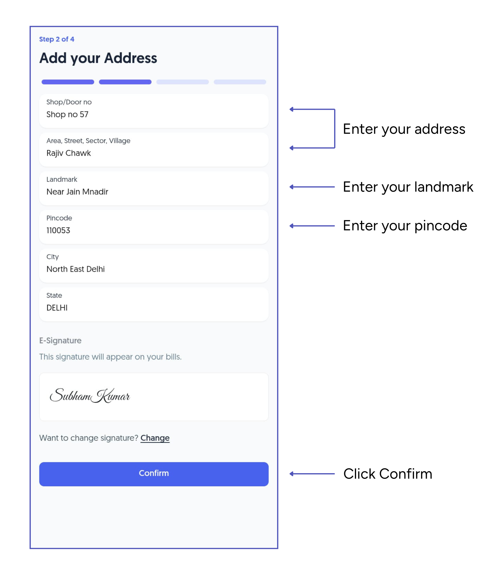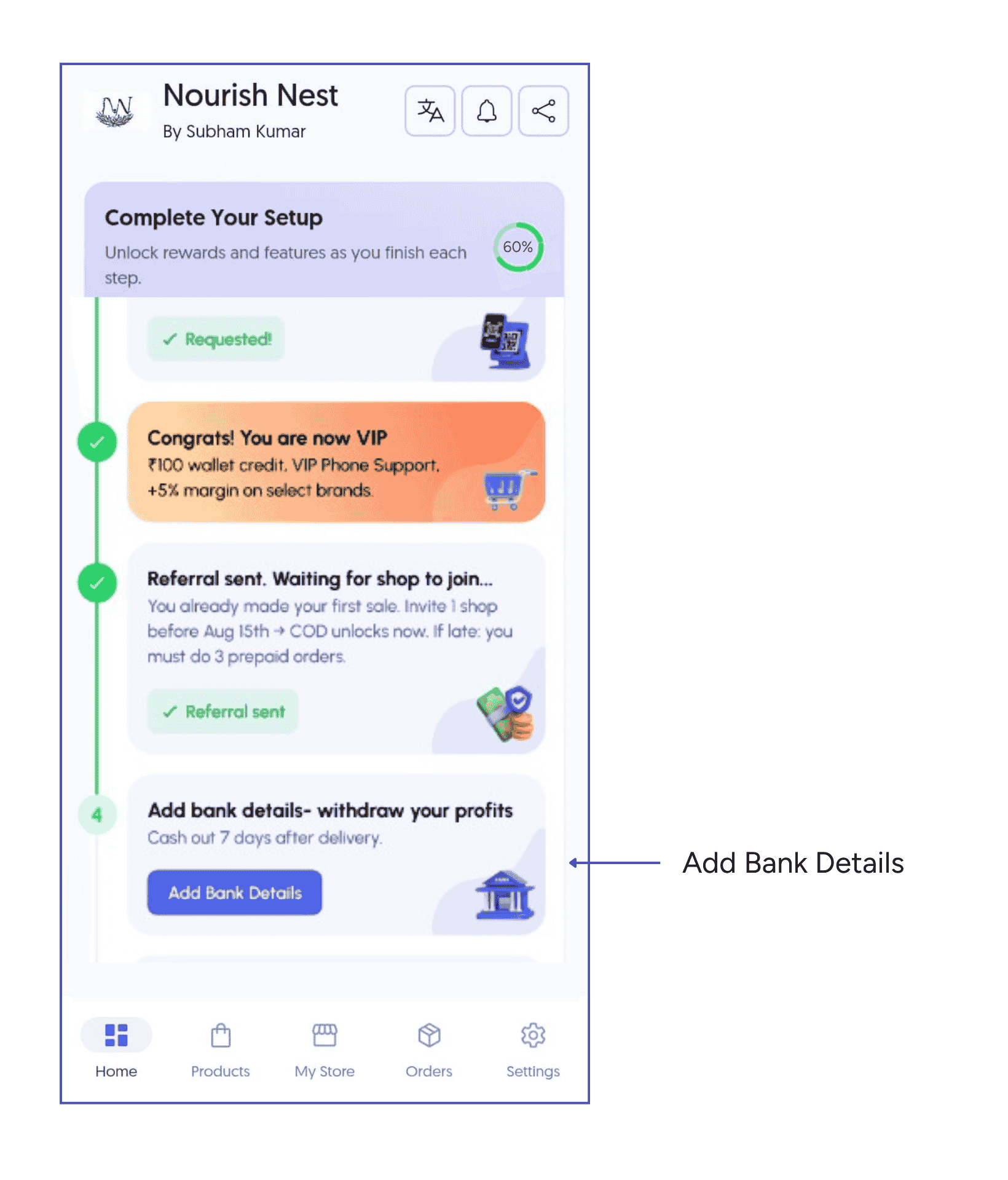 After launch, you’ll see a checklist to unlock all features. Example: Add GSTIN, upload bank details, set discounts.