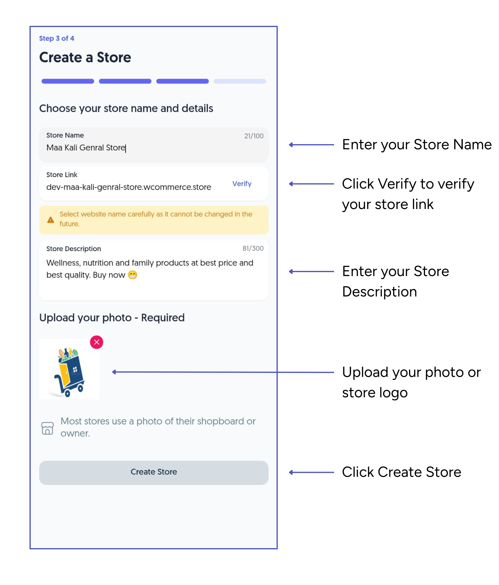 Your store name becomes your store link (example: Maa Kali General Store → maa-kali-general-store.wcommerce.store).